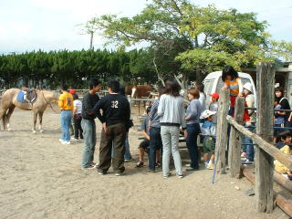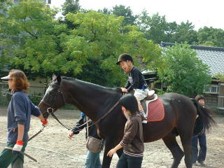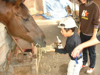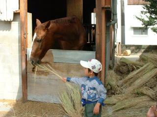 怖い物知らずのバルン。 このあと、馬舎の中に入り込み、 馬の足を両手で「ギュー」しました。 見ている方はびっくり。 本人は大喜び。 |